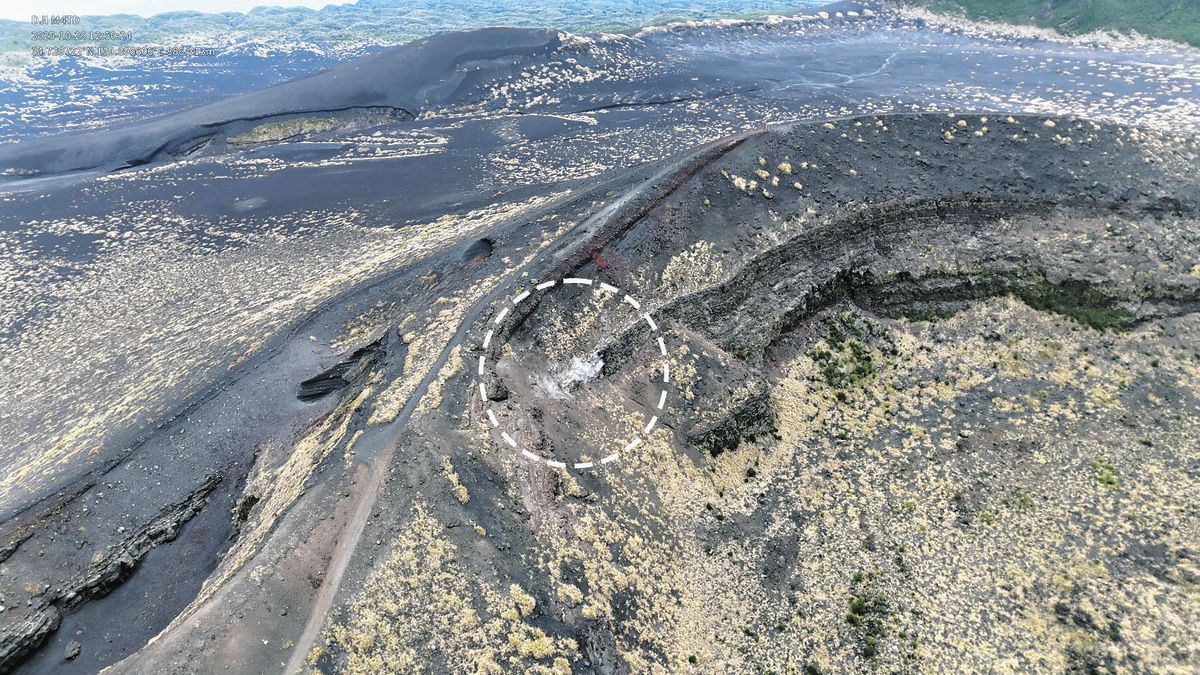 ドローンのカメラが捉えた三原山の火口周辺。急斜面から白い噴気が立ち上っていた(点線内)=アジア航測提供