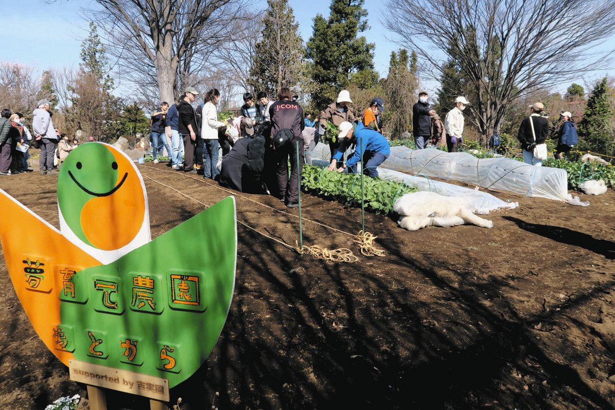 グランドオープンデーに、畑で収穫体験をする参加者=いずれも世田谷区で