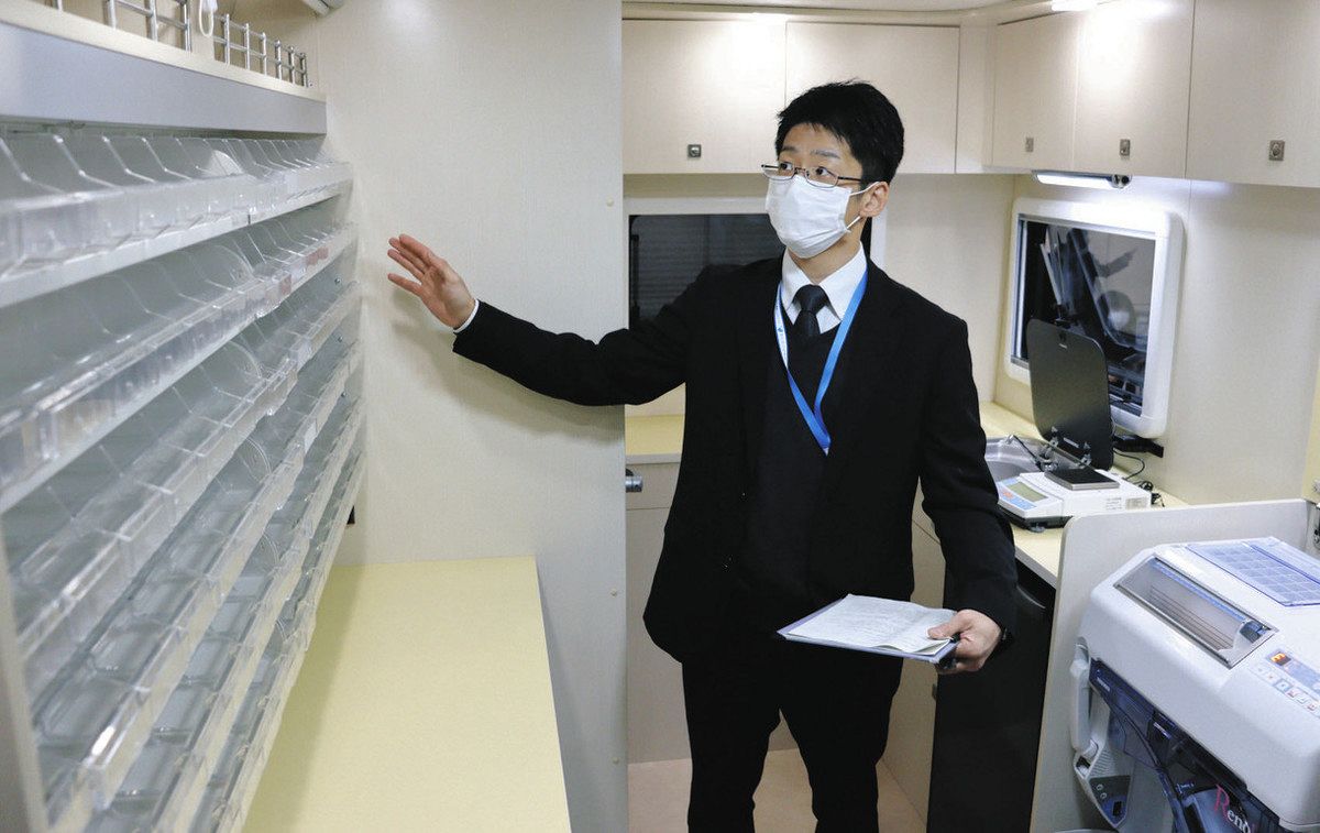 車両はキャンピングカーを改造。車内に医薬品や調剤台、分包機などの設備、給水タンク、電源などを搭載し、携帯トイ...