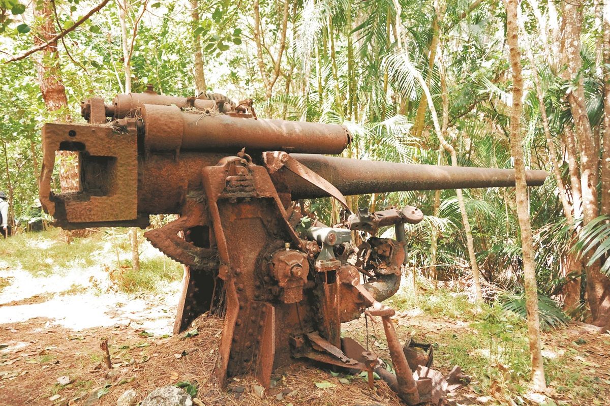 森の中に残されている旧日本軍の「十年式十二糎高角砲」=いずれも東京都小笠原村の父島で