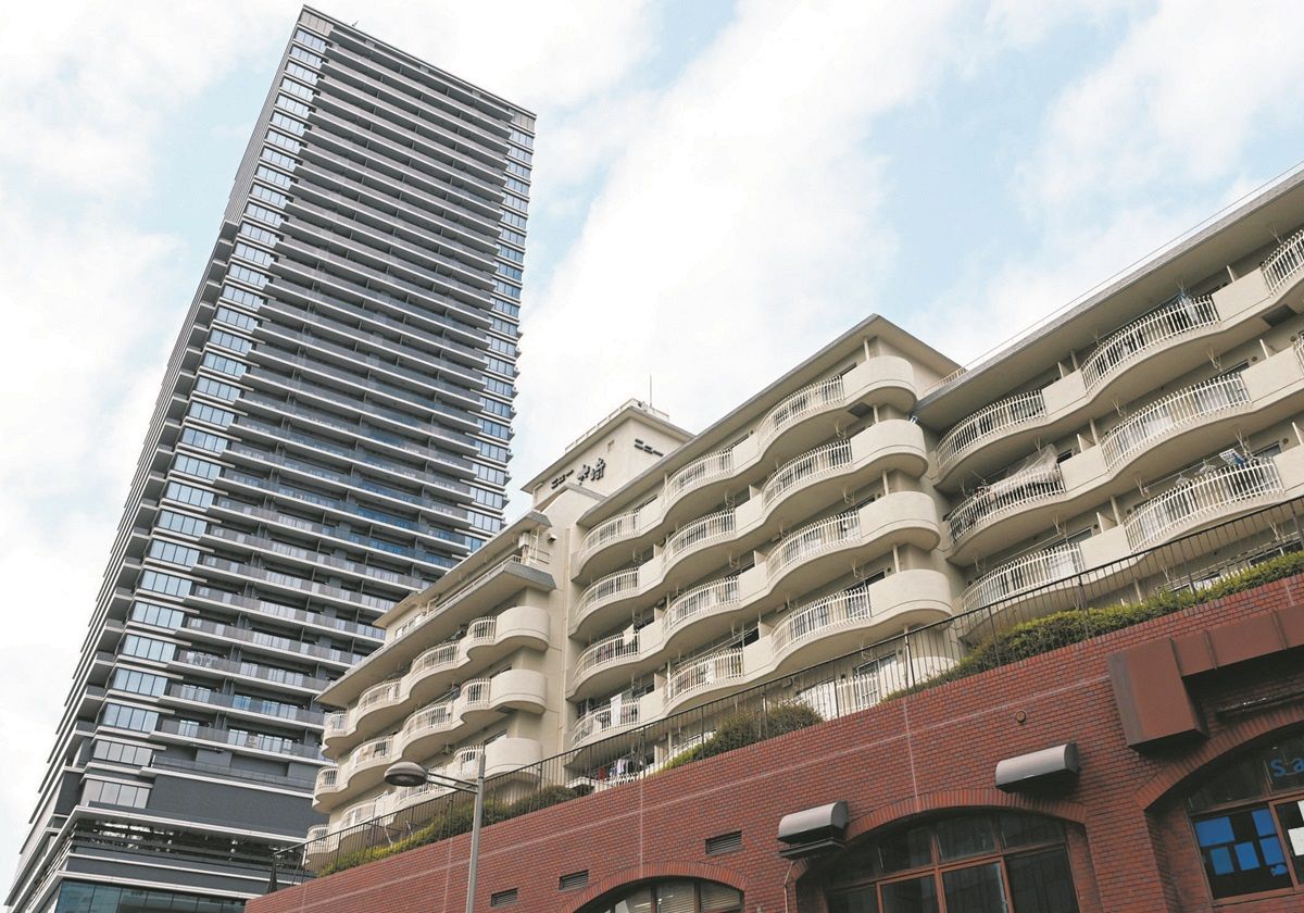 大崎駅西口の駅前に立つマンション「ニュー大崎」(手前)。住民らは再開発後、背後のマンションへの移転を勧められている=東京都品川区で(中村千春撮影)