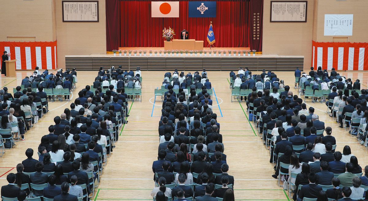 児童数が多いため、午前と午後に分けて行われた晴海西小の入学式=8日、東京都中央区で(木戸佑撮影)