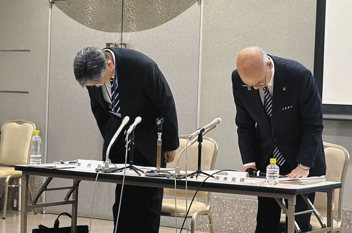陳謝し、頭を下げる葛飾区の青木克徳区長(右)=いずれも葛飾区で