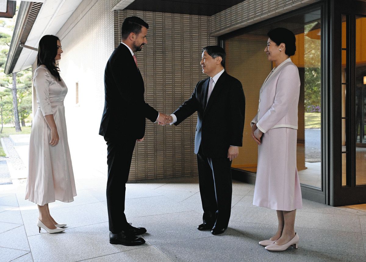 モンテネグロのミラトビッチ大統領夫妻を出迎えられる天皇、皇后両陛下=21日、皇居・御所で(代表撮影)