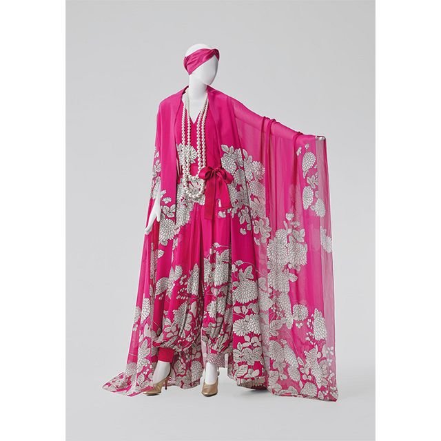 鮮やかなショッキングピンクに白い菊の花が全面に染め抜かれている/森英恵 《イヴニングアンサンブル (ジャンプスーツ、カフタン「菊のパジャマドレス」)》1966 年 ハナヱ・モリ 島根県立石見美術館 撮影: 小川真輝