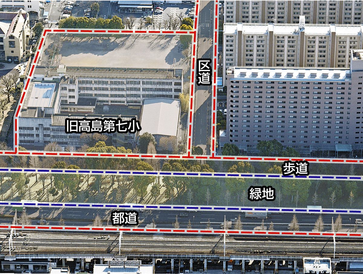 区道の延伸計画は、タワマン建設予定地に立つ旧高島第七小学校(旧高七小)を解体するために持ち上がった。区は、学校西側の区道を延伸し都道の高島通りとつなぎ、工事車両の出入りをしやすくしようとしていた。