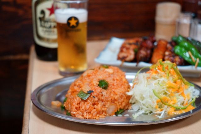 ヤキトリで一杯……の気分の店ではあるけれど、今回はここのチキンライスを目当てにしてきた。以前、西荻窪のムーハンでシンガポール式のチキン(蒸し鶏)ライスをいただいたけれど、こんどはいわゆる日本洋食のケチャップ味のチキンライスだ。玄関の脇の年季が入ったショーケースにサンプルが掲げられているが、銀色ステンレスの楕円の皿に舟型の成型されたチキンライスが盛りつけられている。