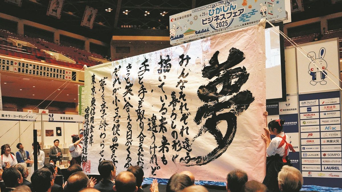 安田学園書道部がパフォーマンスを披露した「ひがしんビジネスフェア」開会式=東京都墨田区で