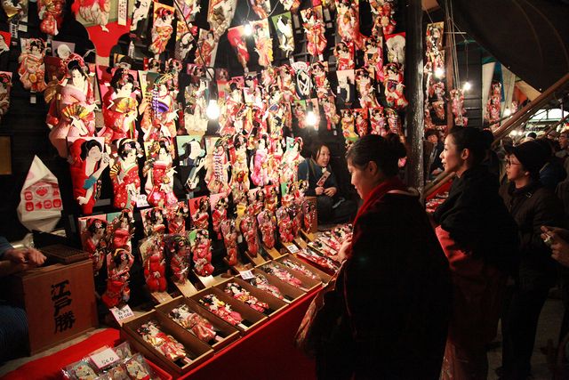 「羽子板市」開催中は色鮮やかな羽子板が境内にずらりと並びます。江戸情緒たっぷりで歩くだけでも楽しい雰囲気です。