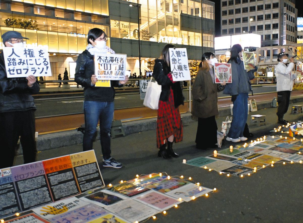 難民ら在日外国人の人権を侵害しているとして、改定入管難民法の見直しを訴える「改悪反対アクション」が11月29日夜、東京・新宿駅南口であった。参加者たちはリレー形式で、非正規滞在者の強制送還を促進する出入国在留管理庁の「ゼロプラン」や外国人排斥の動きに反対するスピーチをした。