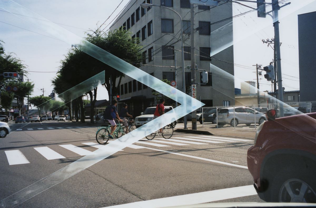 自転車に乗った少年たちが横断歩道を走る瞬間を捉えた作品は、数年前に帰省した金沢市内で母親の運転する車が停車した際に助手席から撮った。その写真に三色旗をイメージした図形を重ねることで、少年たち、撮影する森さん、森さんを見る母親という3者のまなざしを強調したという。