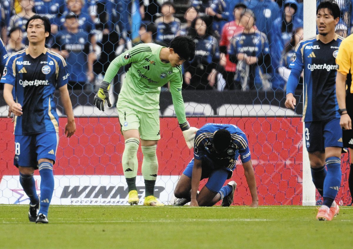町田-横浜M後半、オウンゴールで横浜F・マリノスに3点目を許し、ピッチに膝をつくFC町田ゼルビアの望月ヘンリー海輝(中央右)ら=5月31日、町田GIONスタジアムで(芹沢純生撮影)