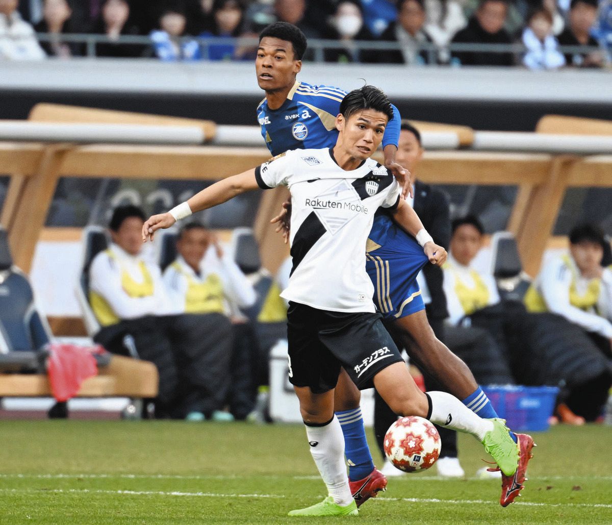 町田-神戸前半、ヴィッセル神戸の佐々木大樹(手前)と競り合うFC町田ゼルビアの望月ヘンリー海輝=11月22日、国立競技場で(芹沢純生撮影)