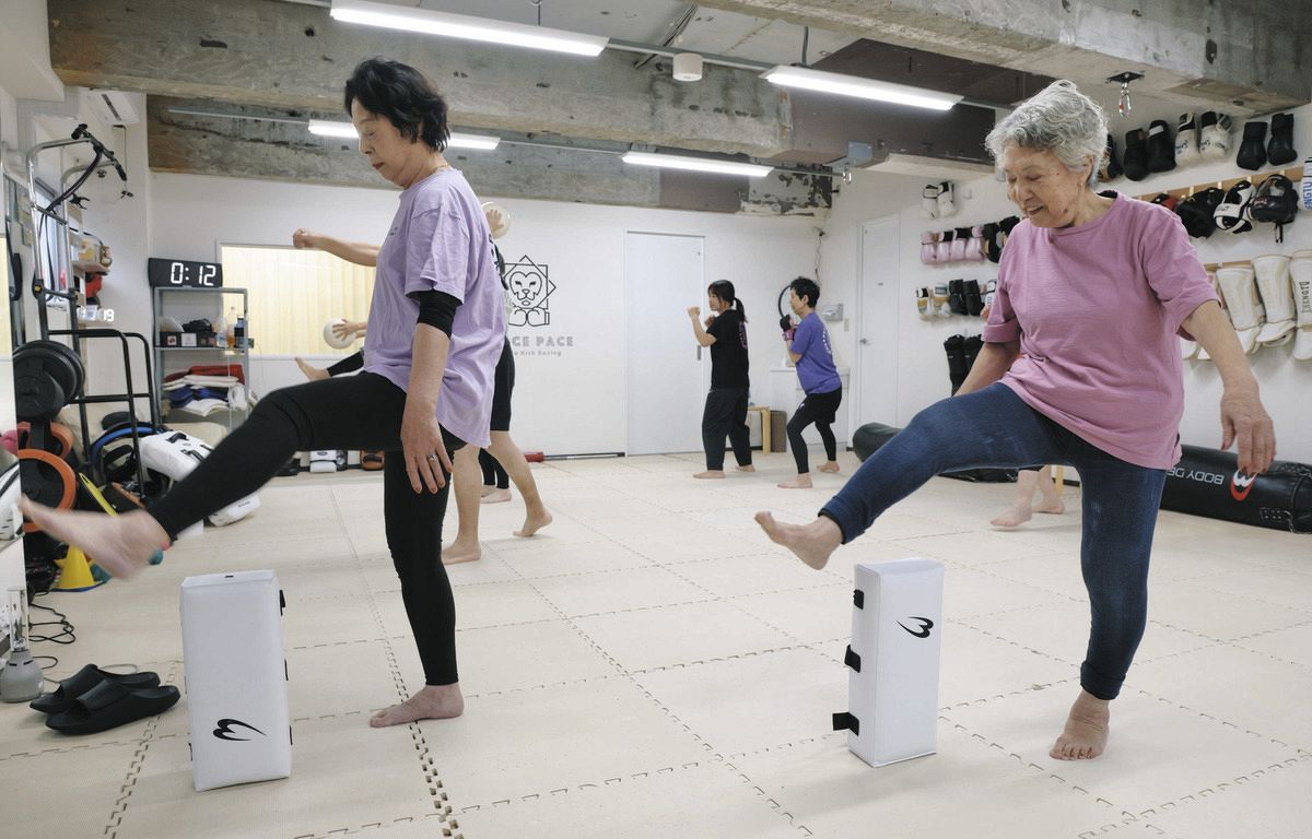 小田急線豪徳寺駅から徒歩5分のビル3階にキックボクシングジム「PEACE PACE」(ピースペース)はある。平日午後1時からのクラスは70歳以上が対象で、相談に応じて60代の人も受け付ける。