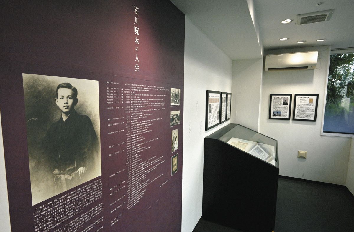 文京区との関わりを紹介するパネルなどが並ぶ石川啄木終焉の地顕彰室=文京区小石川で(田中健撮影)