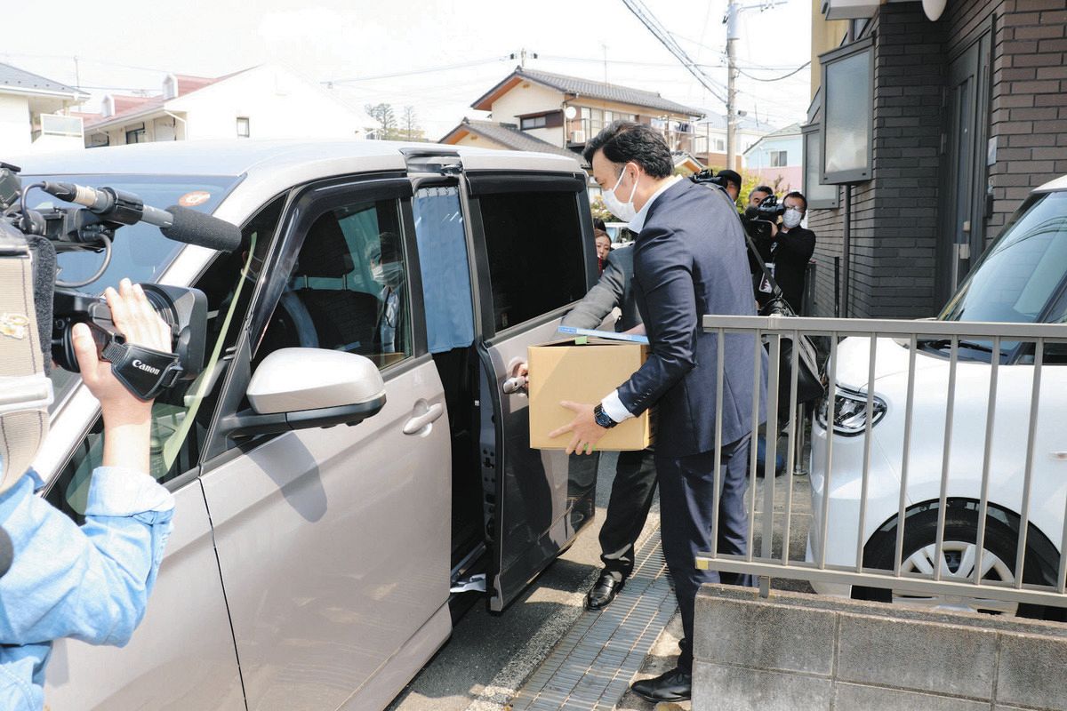 広川容疑者の自宅に入り、段ボールを抱えて出てきた警視庁の捜査員=川崎市多摩区で