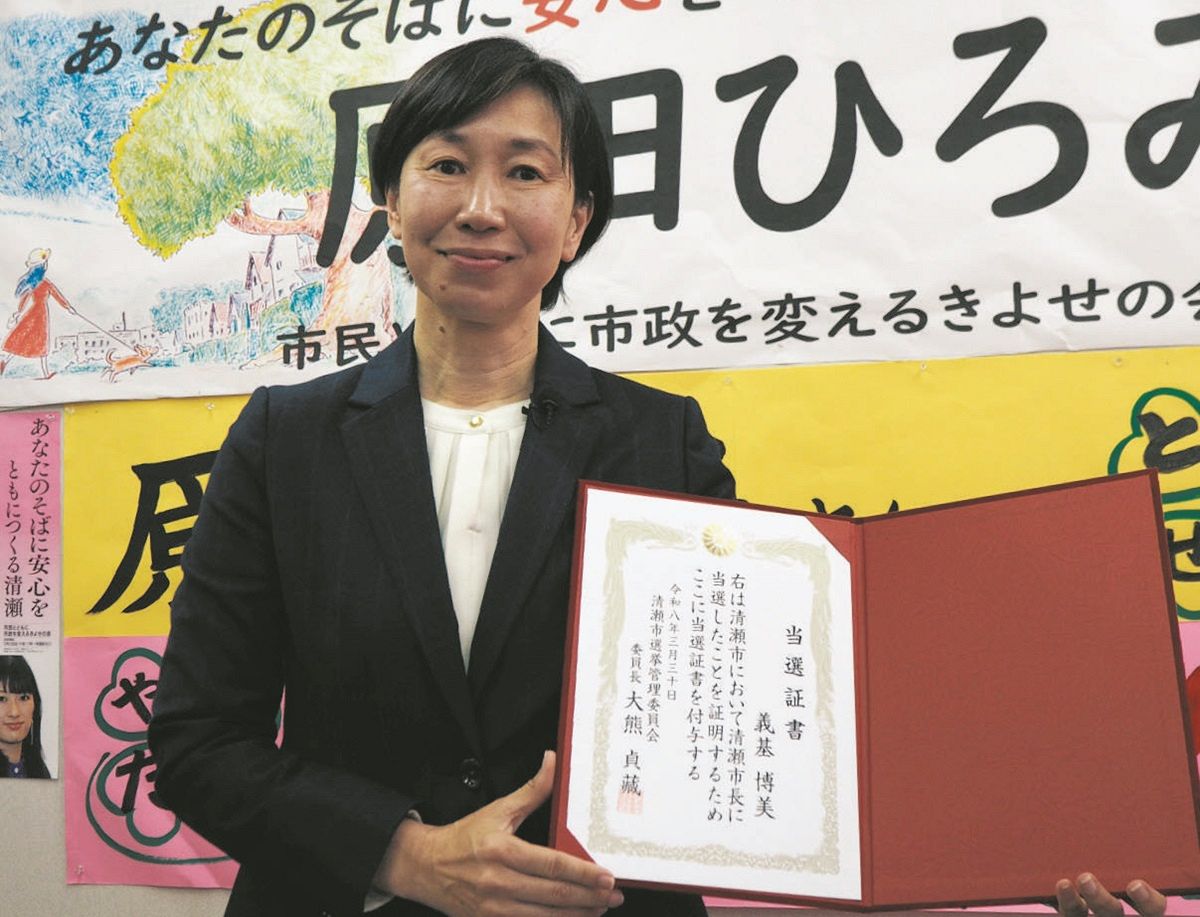 共産党によると、全国で共産党籍がある現職首長は、埼玉県蕨市長、大阪府忠岡町長、長野県中川村長に次いで4人目。都内で共産党籍のある市長の誕生は、1996年に初当選し4期務めた狛江市の矢野裕氏以来。清瀬市の女性市長誕生は初めて。