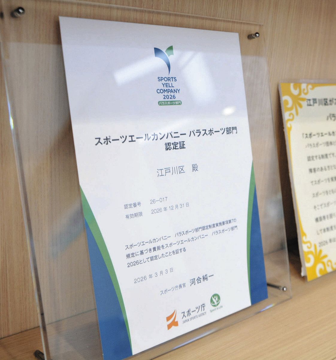 パラスポーツの普及や推進のために関係団体と連携している自治体や企業に贈られる、スポーツ庁の認定制度「スポーツエールカンパニーパラスポーツ部門2026」に、東京都江戸川区が選ばれた。都内の自治体では初めて。認定は3日付。