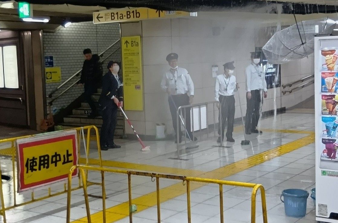 天井から激しく大量の水が…丸ノ内線霞ケ関駅で漏水 モップを手にした駅員たちが対応に追われる